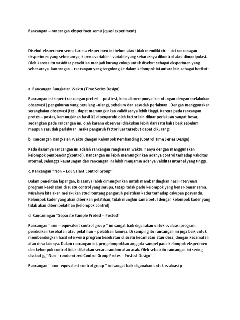 Quasi-experimental Designs Chris Fife-Schaw contents 41 Introduction 42 Pre-experiments 43 Quasi-experiments 44 Non-equivalent control group designs 45 Time series designs 46 Time series with non-equivalent control group designs 47 Modiļ¬ cations to the basic designs 48 Conclusion 49 Exercises 410 Discussion questions 411 Further. Jurnal penelitian quasi eksperimen berikut ini adalah jurnal penelitian quasi eksperimen yang bisa anda download secara gratis di website kami. This means there may be systematic differences between the groups.