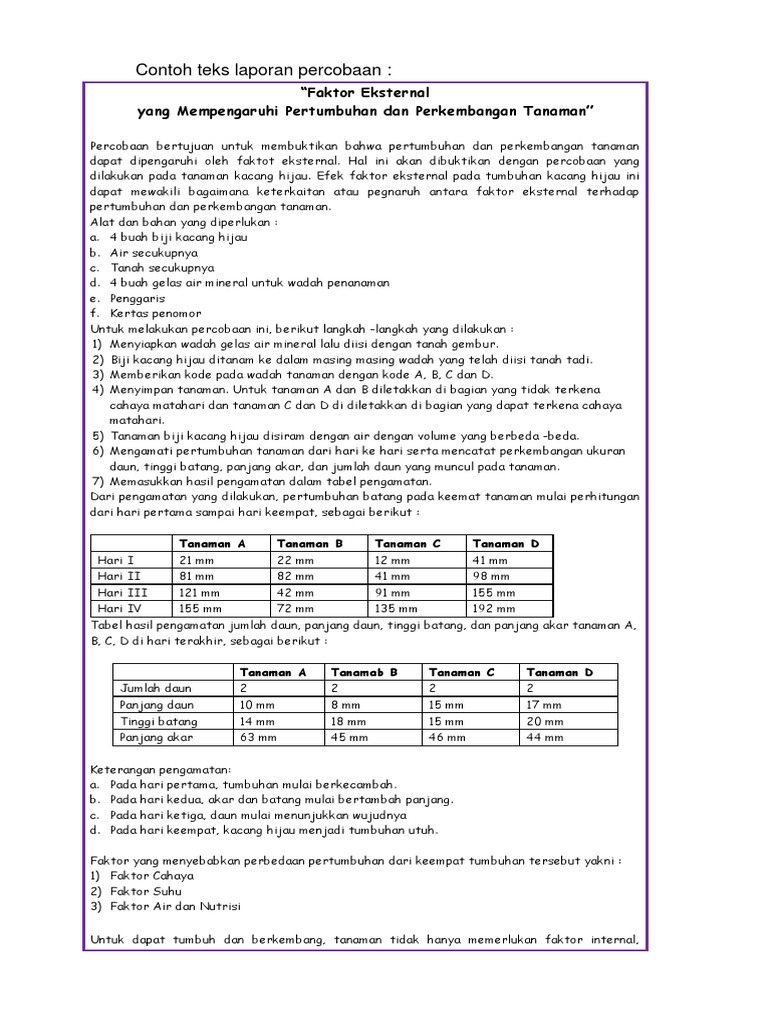 Saat itu terlihat kuncup batang mulai terlihat diatas permukaan tanah dengan panjang rata rata 1 cm. Nah laporan percobaan tersebut umumnya disebut sebagai teks laporan percobaan. 12 Rumusan Masalah 121 Apakah pengaruh factor eksternal cahaya matahari terhadap pertumbuhan tanaman kacang hijau.