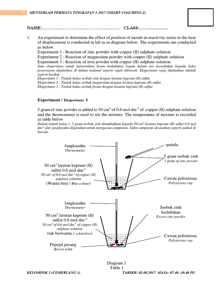 Keputusan eksperimen dinyatakan di bawah. Eksperimen SPOT Untuk Kertas 3 Kimia SPM 2013. Soalan dalam bahasa Inggeris mendahului.