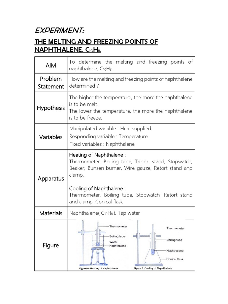 Sebuah tabung uji diisi denga naftalena sehingga 1 per tiga penuh. Ini boleh digunakan bagi menguji ketulenan sesuatu bahan. Takat lebur dan takat didih Tinggi Tinggi Rendah 6.