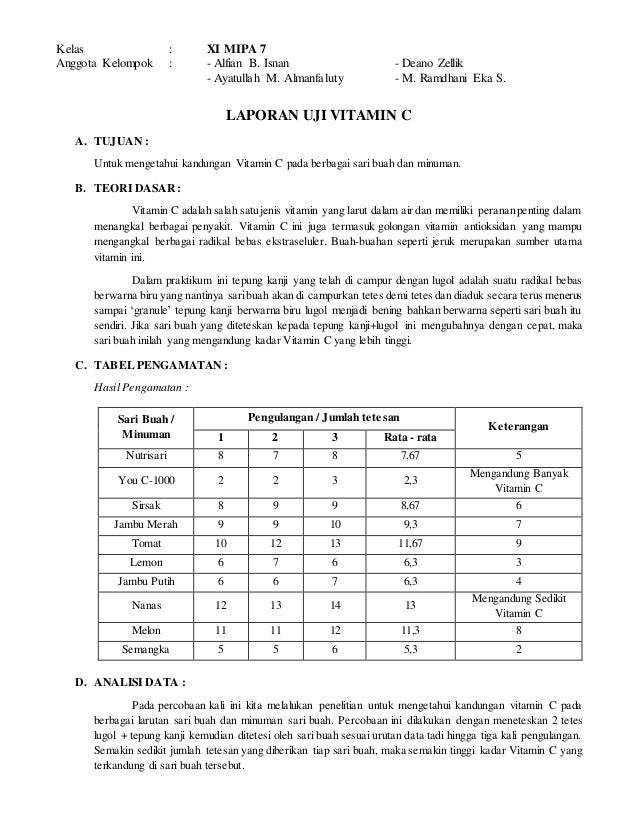 Eksperimen uji vitamin c. LAPORAN EKSPERIMEN KIMIA. Eksperimen dengan memeriksa kadar vitamin C pada buah nanas segar dan buah nanas kaleng. Jenis penelitian ini adalah penelitian eksperimen tentang perubahan kadar β-karoten dan vitamin C pada buah pare dari efek pengolahan yang berbeda dilakukan dengan menggunakan penelitian eksperimen dengan uji hedonik yang meliputi tekstur warna dan aroma dari manisan basah pare dan pickle pare Momordica charantia L.