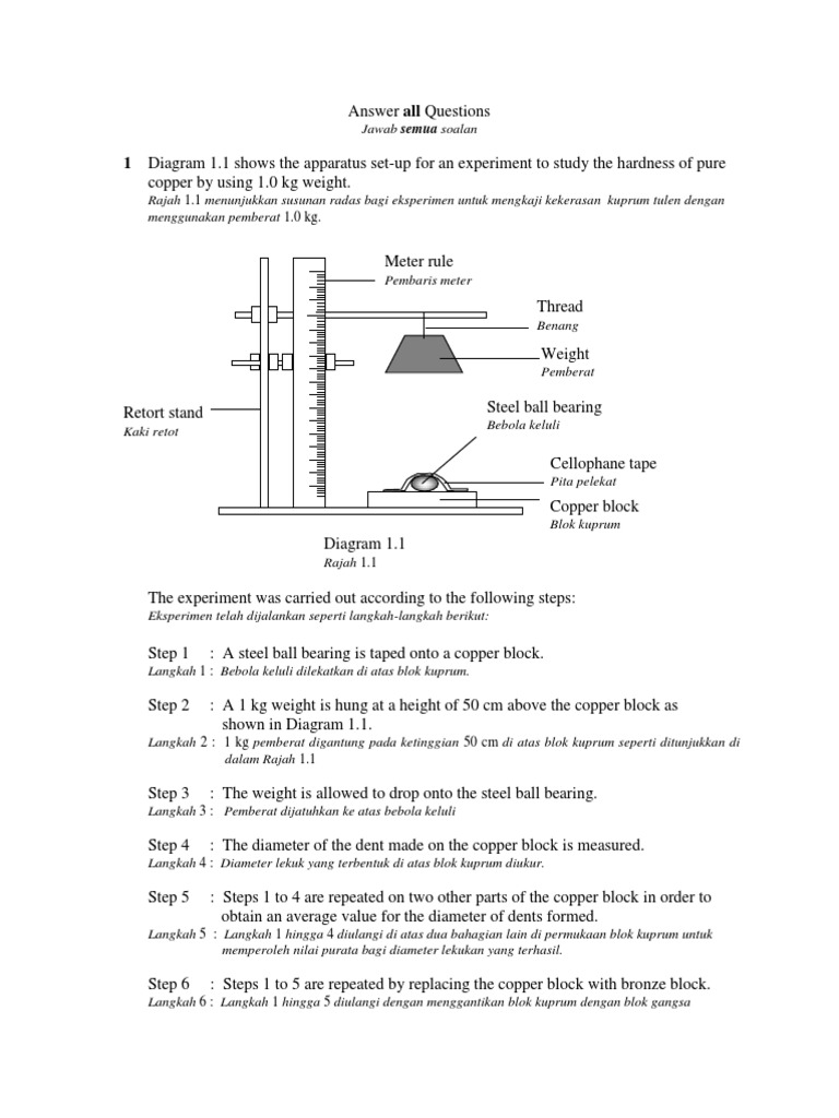 Eksperimen untuk mengkaji kekerasan aloi dan logam tulennya. Jadual 2 menunjukkan keputusan eksperimen. Jisim dengan inersia 2. 1 Diagram 1 shows the apparatus set-up for an experiment to study the hardness of pure copper and bronze by using 10 kg weight.