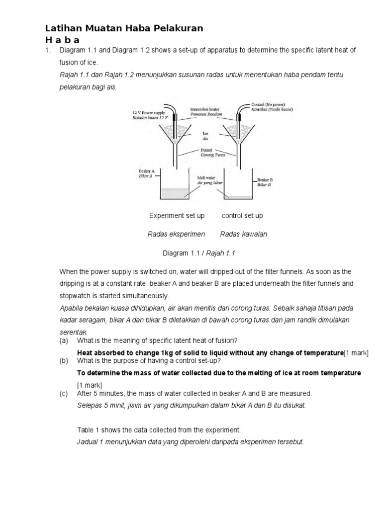 Diagram 3 shows the arrangement of apparatus of an experiment to determine the specific latent heat of fusion of ice. Diagram 1 Rajah 1 Q1 Q2 and Q3 are the heat energies released during the cooling process. Haba pendam tentu pelakuran ais 334 105 J kg1 5.