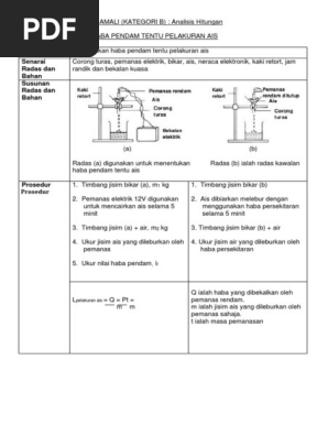 Eksperimen menentukan haba pendam tentu pelakuran ais. S834 Membandingkan haba pendam tentu pelakuran dan haba pendam tentu pengewapan bagi satu bahan dari segi ikatan antara molekul. Menentukan haba pendam tentu pelakuran ais Radas a digunakan untuk menentukan haba pendam tentu ais Radas b ialah radas kawal Prosedur. 435 Menyelesaikan masalah yang melibatkan haba.
