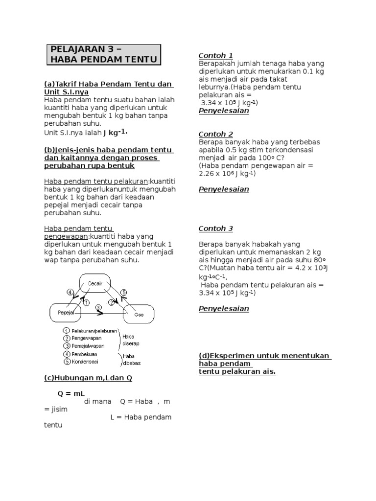 4 i Muatan haba tentu air ii Muatan haba tentu aluminium 433 Mengeksperimen untuk menentukan 5 i haba pendam tentu pelakuran ais ii haba pendam tentu pengewapan air. Haba pendam tentu l suatu bahan ialah tenaga haba yang diperlukan untuk menukarkan 1kg bahan itu daripada satu keadaan fizik ke satu keadaan fizik yang lain tanpa perubahan suhu.