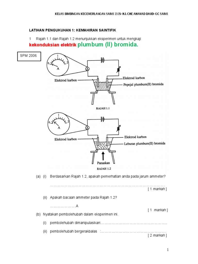 Eksperimen mengkaji kekonduksian elektrik plumbum bromida. Arus elektrik dialirkan menerusi leburan plumbumII bromida. Plumbum II bromida mempunyai takat lebur yang lebih rendah 373ᵒC daripada natrium klorida801ᵒC. SPM 2006 a i Berdasarkan Rajah 12 apakah pemerhatian anda pada jarum ammeter.