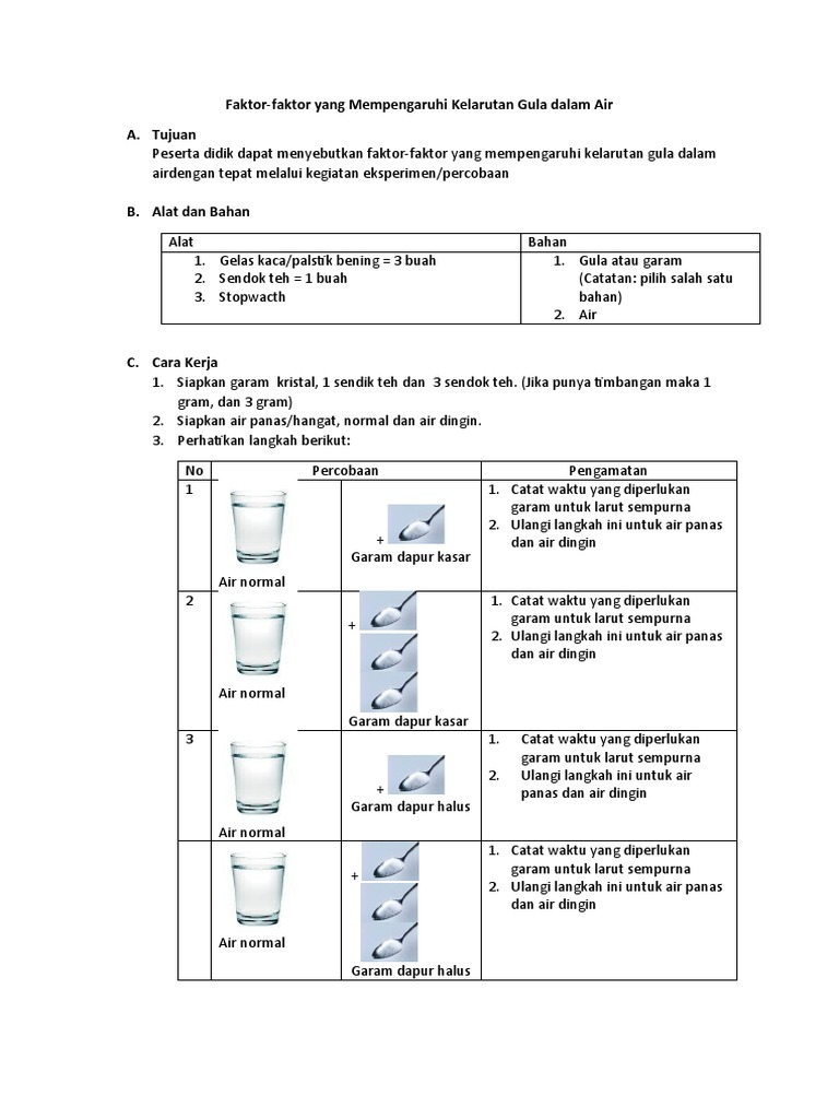 Antara bahan untuk larut vs tak larutgaramgulasirapbatukayupasir dan susu tepung. Garam larut garam larut -Pecahkan sebatian kepada anion dan kation bagi menentukan larutan yang sesuai untuk penyediaan garam ini. Sebab eksperimen sains tak melulu berkutat dengan teknologi mumpuni ataupun bahan-bahan yang langka beredar di pasaran.